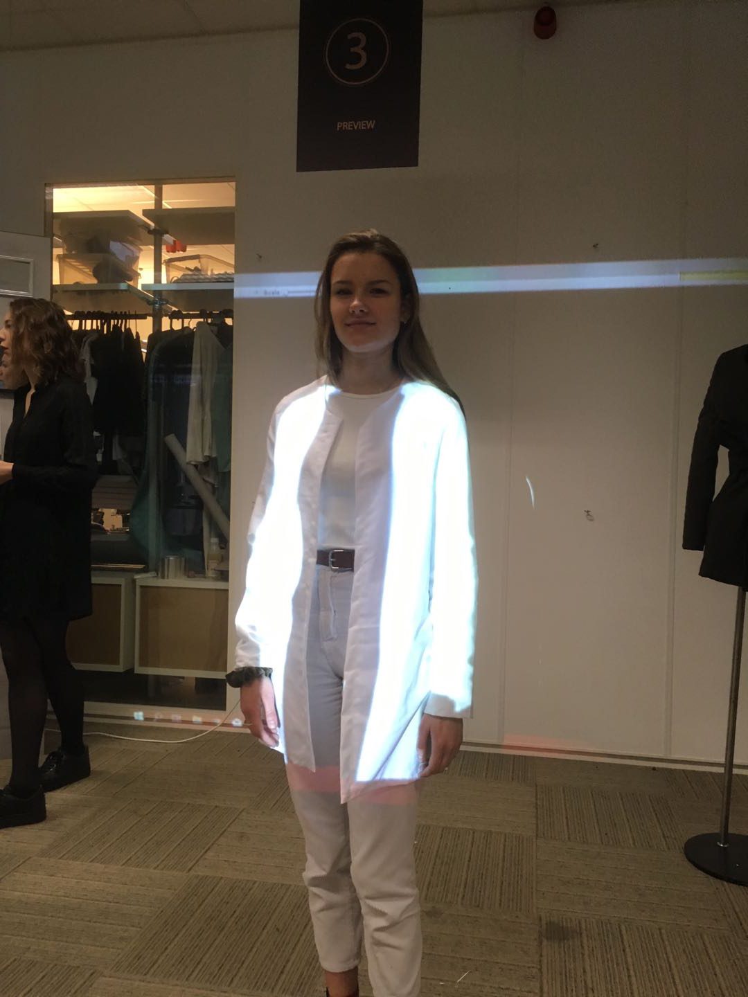 3. During the preview stage the system presents the preliminary outcome of the garment by projecting it onto the user, in this stage adjustments to the design can still be made.