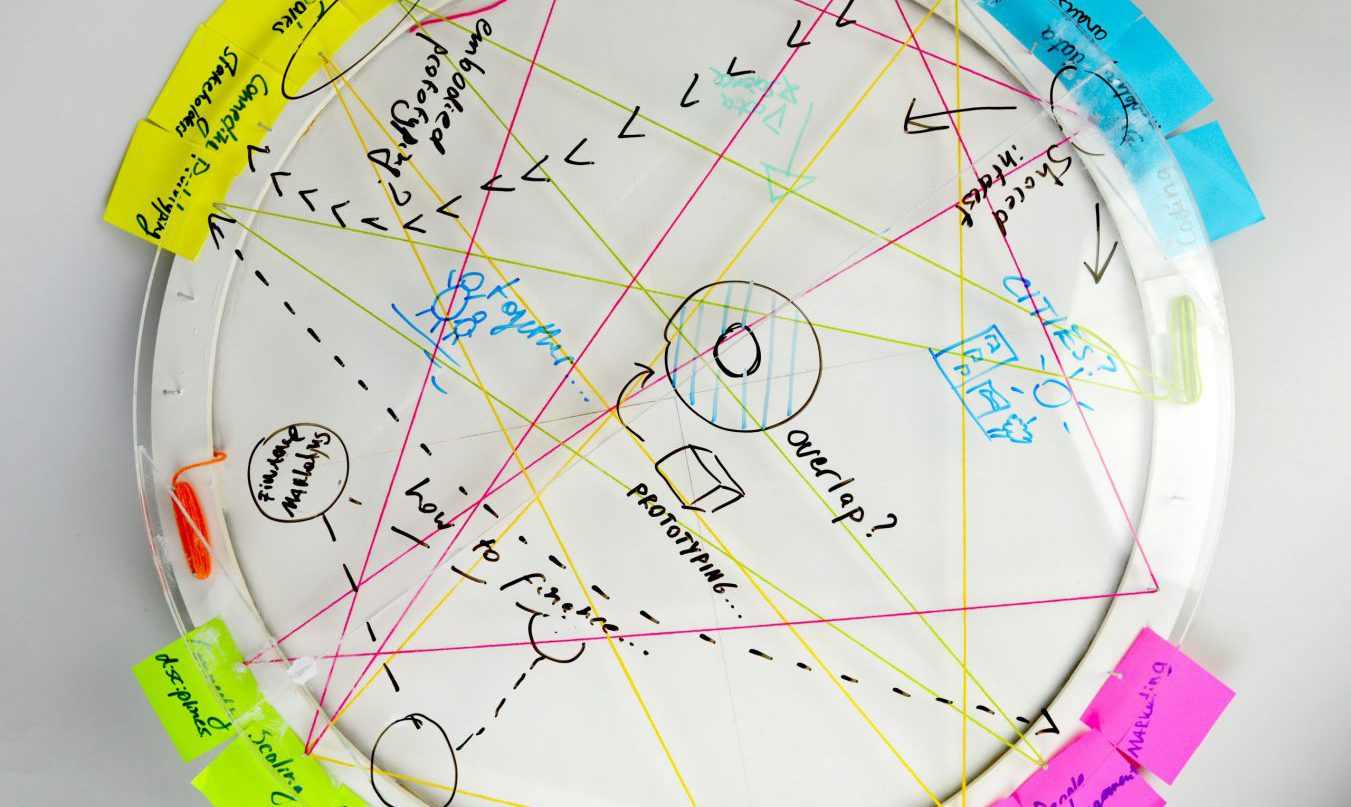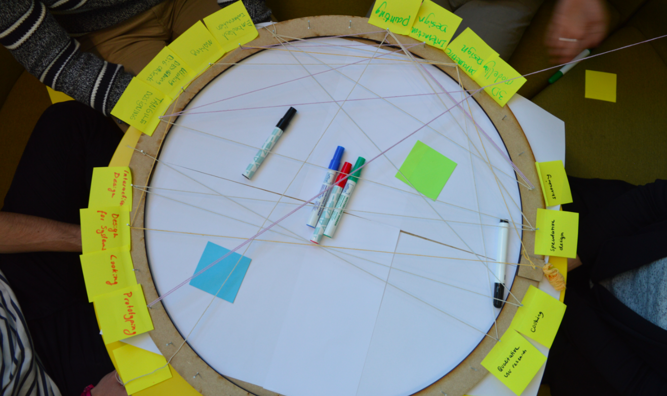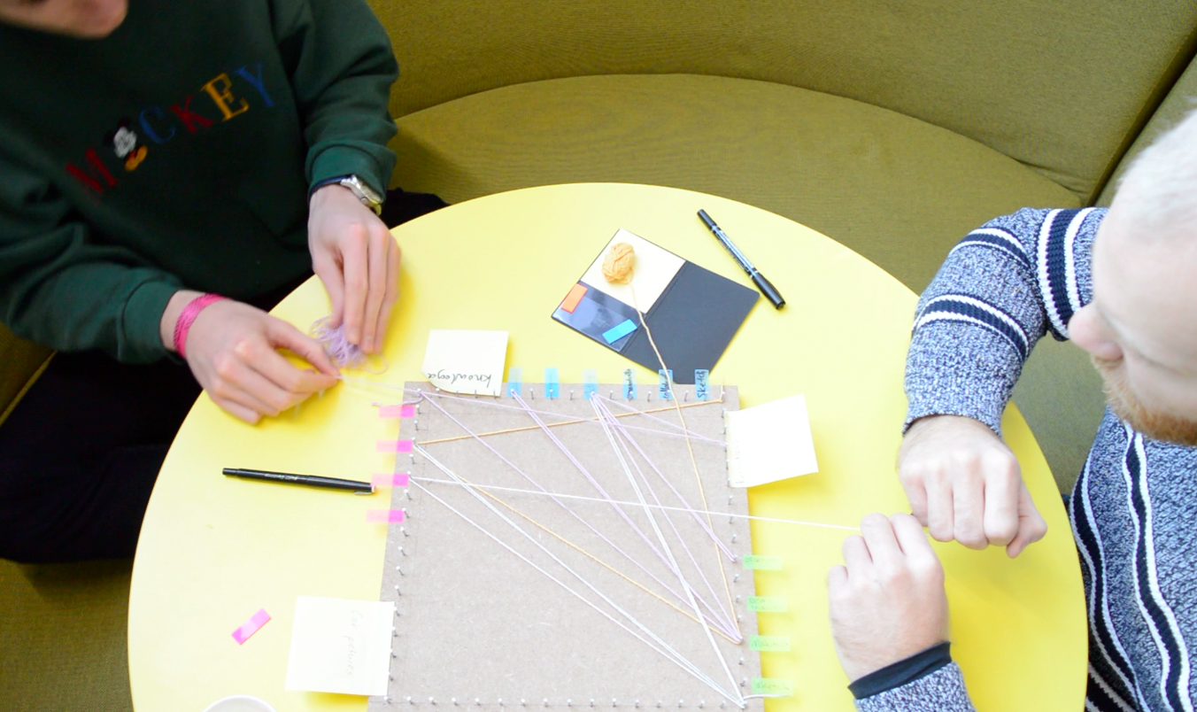 Exploration with a square board with nails along the edges. Each stakeholder could write down their needs and skills and use colored wires to connect these on the board. Through using this, each stakeholder could find each other's skills and interested in withing a collaboration project. Also, the embodied sketch allows collaborators to interact and engage in a fun way to connect to one another.